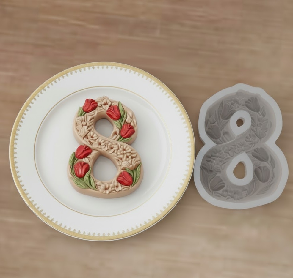 Silikona veidne skaista un eleganta 8. marta dekora ar tulpēm izgatavošanai. Izgatavota no pārtikas kvalitātes silikona. Piemērota lietošanai ar šokolādi, konfektēm, vasku, ziepēm, polimērmālu un citiem materiāliem.